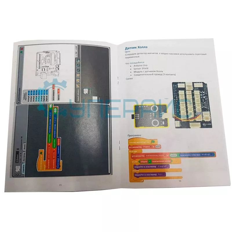 Компоненты поддерживают работу со средой разработки Arduino IDE, а также визуальной средой программирования Scratch. Обе располагают низким порогом вхождения и дружелюбны к пользователю. Для легкого освоения платформы контроллера, азов программирования и конструирования роботов, а также принципов работы электронных устройств в набор включена подробная инструкция, уроки представлены на русском языке.