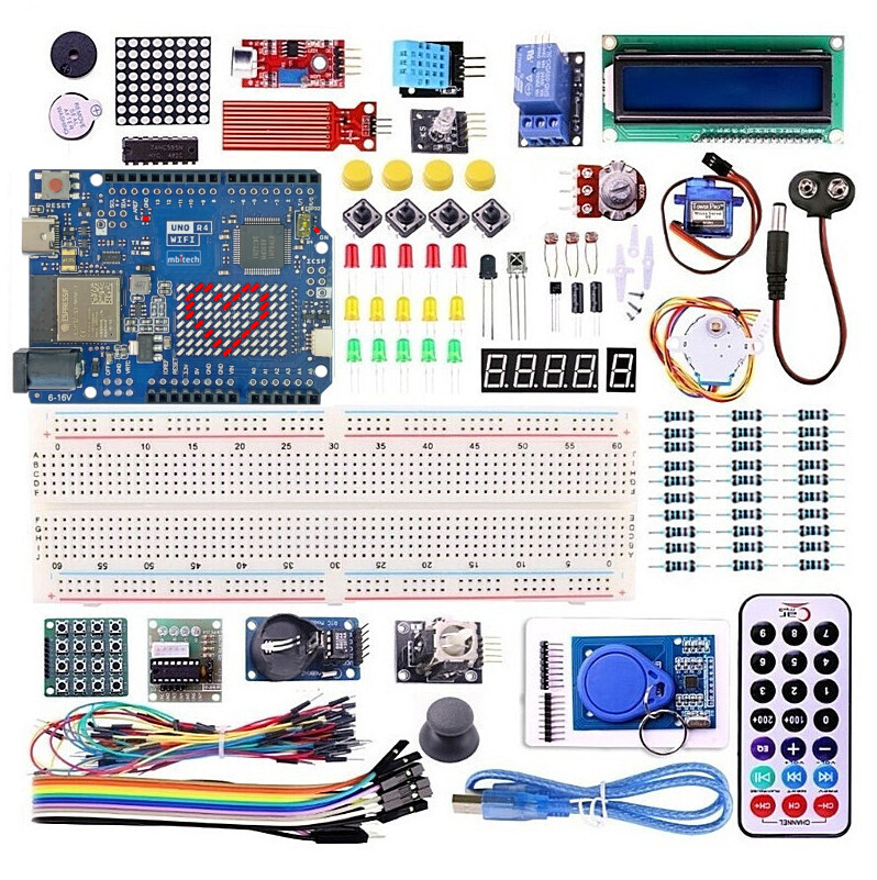 Книга «Изучаем Arduino UNO R4. Программирование и примеры проектов для UNO R4 Minima и UNO R4 WiFi» 1 Контроллер UNO R4 WiFi 1 USB Type-C кабель для Arduino 1 Датчик воды и глубины погружения 1 Датчик звука 1 Датчик огня 1 Датчик температуры аналоговый 1 Датчик температуры и влажности DHT11 1 Двигатель шаговый 1 Плата управления для шагового двигателя 1 Дисплей символьный LCD1602 1 Интерфейс I2C для дисплея 1602 1 Зуммер активный 1 Зуммер пассивный 1 ИК-приёмник 1 ИК-пульт дистанционного управления 1 Индикатор 7-сегментный одноразрядный 1 Индикатор 7-сегментный четырёхразрядный 1 Цветные монтажные перемычки FM для беспаечных макетных плат 1 Кнопка тактовая 4 Цветные монтажные перемычки BBJ-65 1 Джамперы 2 Макетная плата для монтажа без пайки 830 точек 1 Матричная 16-кнопочная клавиатура 4х4 1 Микросхема 74HC595N сдвиговый регистр 1 Модуль 2-координатного джойстика 1 Модуль RGB светодиода 1 Модуль одноканального реле 1 Модуль считывателя RFID-меток 1 Модуль часов реального времени 1 Переходник для Кроны 1 Потенциометр 10 кОм 1 Резистор 220 Ом 10 Резистор 10 кОм 10 Резистор 1 кОм 10 Светодиодная матрица 8х8 1 Фоторезистор 3 Светодиод красный 5 Светодиод зеленый 5 Светодиод желтый 5 Сервопривод SG-90 1