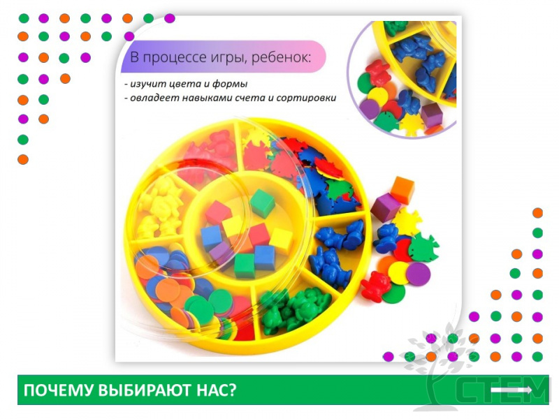Это развивающая логическая игра, в которой нужно сортировать предметы по определенному признаку – цвету, форме, типу или размеру.