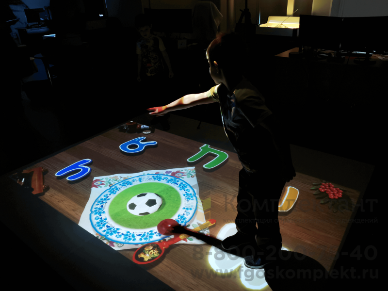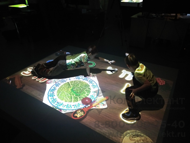 Интерактивный пол Floorium — это интерактивный комплекс, создающий на обычном полу игровую зону с подвижными элементами. Проектор выводит на пол мультимедийный контент, с которым игроки могут взаимодействовать. датчик глубины отслеживает положение игроков и распознает их движения, после чего компьютер, в ответ на действия участников, обновляет изображение.