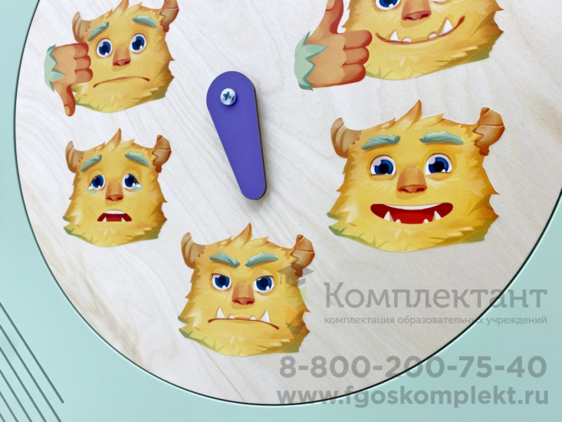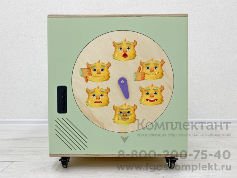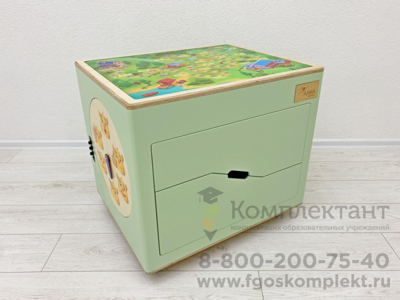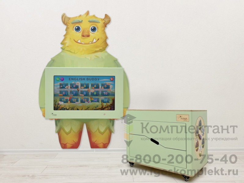 Интерактивную панель держит главный герой - добродушный монстр Бадди (от англ. ‘Buddy’ – приятель). Мобильный куб на колёсиках может передвигаться в любое место класса, где детям удобнее заниматься, и имеет два ящика с настольными играми и дидактическими карточками. По бокам он оформлен бизибордами на тему погоды и настроения, а сверху на крышке – красочная пошаговая игра-бродилка.