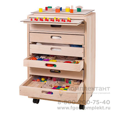 Мобильный стеллаж для хранения модулей изготовлен из натурального дерева (бука) и сконструирован в соответствии с педагогико-эргономическими требованиями, обеспечивает быстрый доступ к дидактическому материалу, простоту обзора и подбора необходимого для занятий материала.
