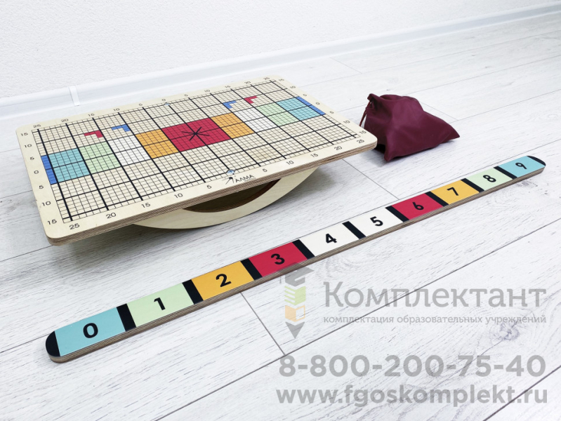 Балансир изготовлен из прочной экологичной фанеры, не имеет острых углов, о которые можно травмироваться. Изделие хорошо отшлифовано и покрыто огнезащитным лаком, стойким к загрязнениям и истиранию. В комплекте идёт набор дополнительного инвентаря для занятий, методическое пособие и универсальный ключ для поворота полозьев.