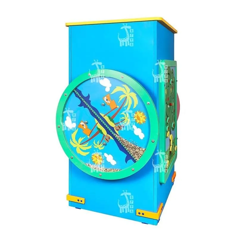 Изделие представляет собой тумбу, на которой расположены развивающие панели. Такая тумба хорошо подойдёт тем помещениям, где нет свободного места на стенах. Вы можете создать уникальную игровую и развивающую систему, используя различные игровые модули.