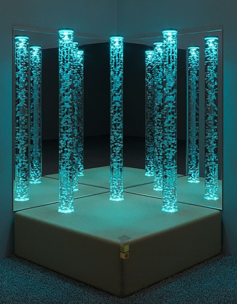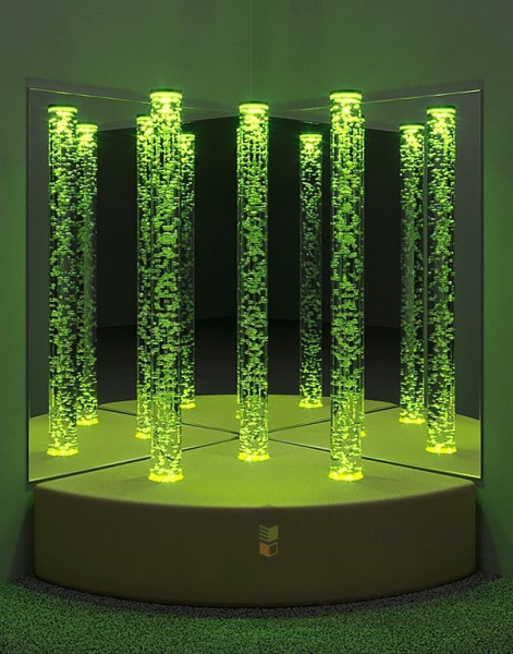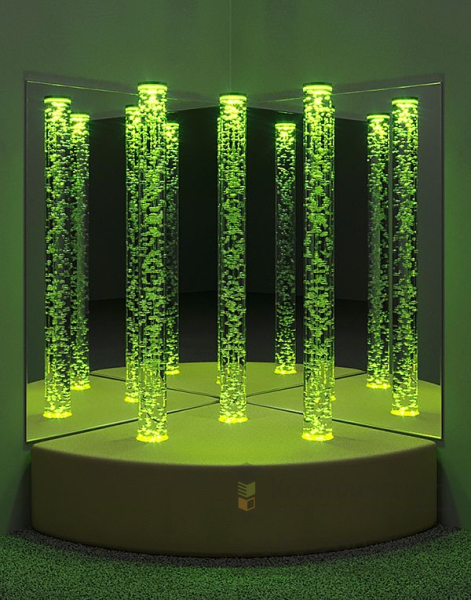 Комплект Сенсорный уголок Трио состоит из 3 воздушно-пузырьковых колонн, мягкого основания, 2 больших безопасных зеркал. Диаметр колонн 10 см, высота — 150 см. Управление при помощи пульта ДУ. Мягкое основание может быть квадратное (75 *75см) или четверть круга ( d=75см). Безопасные зеркала увеличивают визуальный эффект от свечения колонн. Мягкая платформа, окружающая колонны, позволяет удобно расположиться рядом, расслабиться, ощутить чувство комфорта, настроится на приятное взаимодействие с окружающей средой.