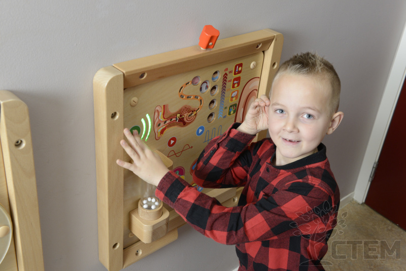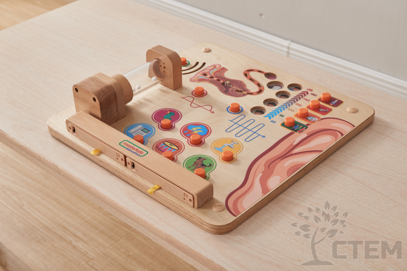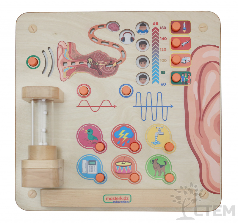 Настенная панель выполнена из березовой фанеры, на лицевой части которой расположена игра с изображением различных звуков людей, животных, птиц, техники. Есть кнопки высокого и низкого тона звука. Глядя на диаграммы звуковых волн, дети могут понять разницу между ними.