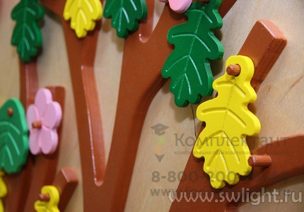 Тактильно-развивающая панель "Времена года" состоит из деревянного основания - ствола с ветками, на которые можно вешать листья и цветы. Цвет листьев - разный.