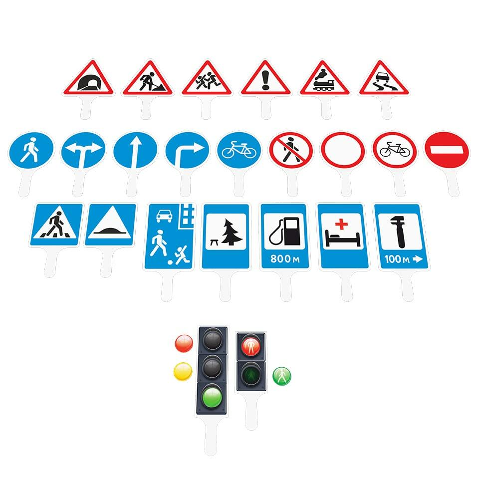 Обучающий игровой комплекс включает в себя комплект из карточек технических средств организации дорожного движения: светофоров с держателями, жезла, свистка и дорожных знаков. Конструкция карточек светофоров имеет магнитные элементы, представляющие сигналы светофора. Также в игровой комплекс включены транспортные и пешеходные карточки дорожных светофоров. Вес: 1,7 кгВ игровой комплекс входят карточки дорожных знаков таких групп: