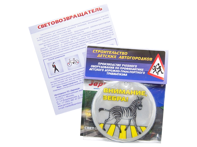 Световозвращающая подвеска высокого качества представляет собой элемент в форме круга, выполненный из скрепленного между собой эластичного световозвращающего материала. Коэффициент световозвращения поверхности подвески составляет 200 кд/лк*м2 согласно требованиям ГОСТ Р 50971-2011. Цвет световозвращающего материала - белый. На лицевой стороне подвески с применением УФ-печати нанесен цветной тематический рисунок, соответствующий возрастной категории (дошкольники и школьники): зебра на пешеходном переходе и надпись "Внимание, зебра!".