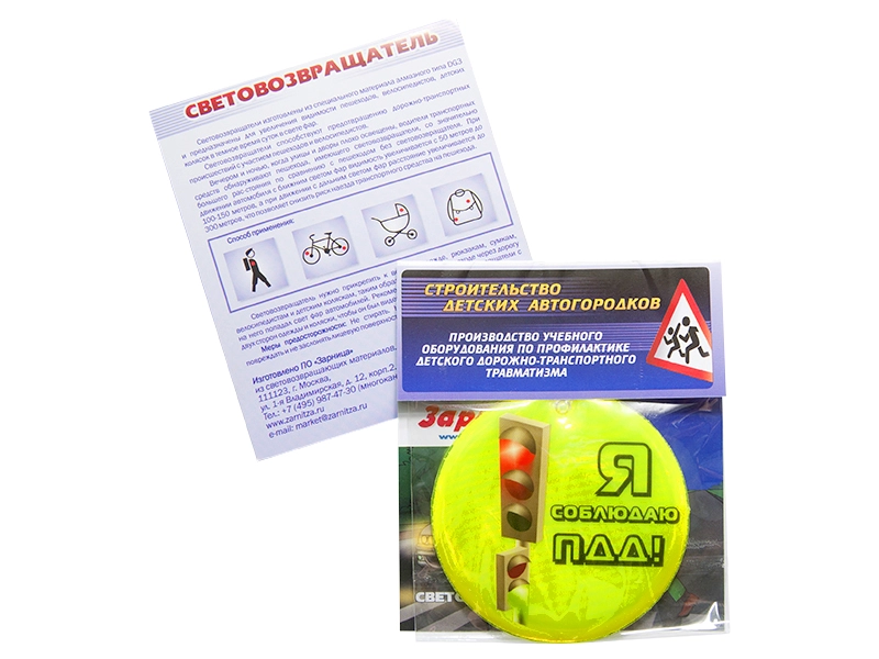 Световозвращающая подвеска высокого качества представляет собой элемент в форме круга, выполненный из скрепленного между собой эластичного световозвращающего материала. Коэффициент световозвращения поверхности подвески составляет 200 кд/лк*м2 согласно требованиям ГОСТ Р 50971-2011. Цвет световозвращающего материала - желтый. На лицевой стороне подвески с применением УФ-печати нанесен цветной тематический рисунок, соответствующий возрастной категории (дошкольники и школьники): два светофора и надпись "Я соблюдаю ПДД!".