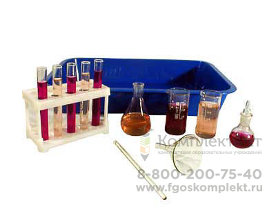 Комплектность: пробирка 14*120 - 5 шт., стакан с меткой 50 мл - 2 шт., штатив для пробирок на 10 гнезд - 1 шт., колба коническая 50 мл - 1 шт., воронка 56-80 - 1 шт., стеклянные палочки - 1 шт., капельница - 1 шт., лоток для раздаточного материала - 1 шт.