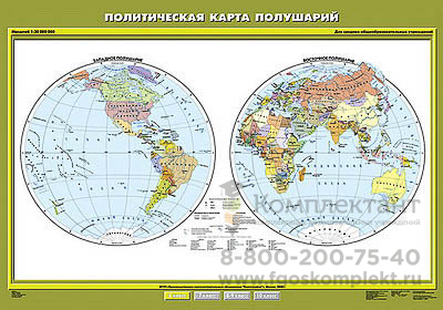 На карте полушарий фоном даны государства и территории мира. Односторонняя печать, двустороннее ламинирование, лицевая сторона покрыта матовым ламинатом.