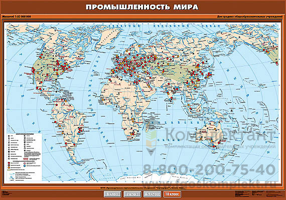 Масштаб 1:25000000, формат 140*100 см. Разнообразными по форме значками на карте показаны места добычи полезных ископаемых, кругами с цветным фоном – крупнейшие и крупные районы и узлы машиностроения, черной металлургии, цветной металлургии, нефтепереработки и нефтехимии, текстильной промышленности. Цветным фоном выделен мировой промышленный пояс. На особой врезной карте показан уровень развития машиностроения в различных странах мира. Односторонняя печать, двустороннее ламинирование, лицевая сторона покрыта матовым ламинатом.