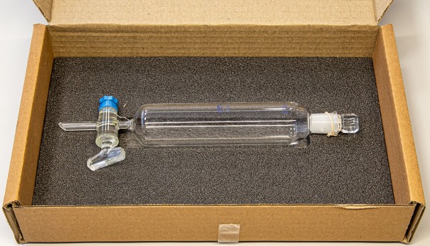 Делительная воронка представляет собой сосуд цилиндрической формы с краном и отводом в нижней части и притертой пробки со шлифом в верхней части устройства.