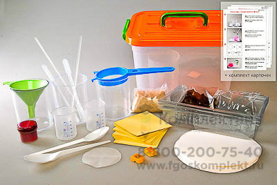 Комплектность: стакан прозрачный пластиковый – 3 шт.; стакан прозрачный пластиковый с отверстиями – 1 шт.; стаканчик пластиковый мерный 50 мл – 2 шт.; сетка – 2 шт.; магнит – 2 шт.; пластиковая ложка – 2 шт.; шпатель – 2 шт.; порошок железа металлического – 1 упаковка; краска – 1 шт.; воронка – 1 шт.; палочка стеклянная – 2 шт.; бумажный фильтр – 1 упаковка; сито – 1 шт.; цветная бумага – 1 упаковка; поднос прозрачный – 3 шт.; песок отмытый – 1 упаковка; торф – 1 упаковка; лист белой бумаги ламинированный – 3 шт.; карточки с пошаговым описанием работ 1–5 – по 3 шт.; контейнер пластиковый – 1 шт.; руководство по эксплуатации - 1 шт.; учебное пособие «Комплект для исследования состояния окружающей среды» (автор И.Л. Марголина – 40 страниц – печать офсетная, обложка полноцвет.) – 1 шт.