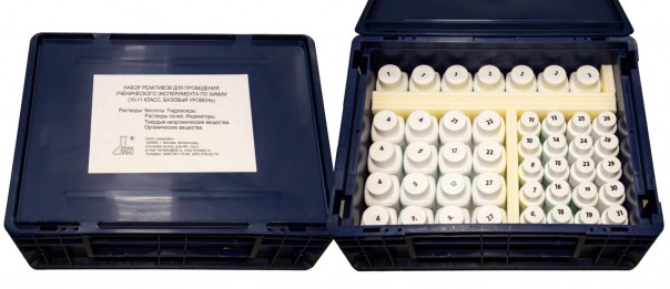Включает 31 готовых к использованию реактивов, в т.ч. (3 кислоты, 2 гидроксида, 11 солей, 2 индикатора, раствор аммиака) , а так же органические и неорганические вещества, которые используются в лабораторной практикуме по химии на базовом уровне в 10-11 классах.