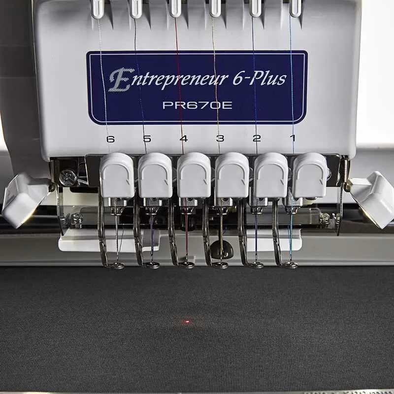 Вышивальная машина PR670E - это идеальный выбор для малого или домашнего бизнеса, а также вышивальных энтузиастов. Эта быстрая 6-игольная машина простая в настройке позволяет вам вышивать большие многоцветные дизайны с минимальным количеством замен нитей и значительно увеличенной продуктивностью по сравнению с традиционными одноигольными машинами. Машина имеет настраиваемую скорость вышивания от 400 до 1000 ст/м. Следует учесть, что максимальную скорость вышивания машина развивает не сразу. За разгон отвечает специальная функция "ускорение". В модели PR670E функция "ускорение" усовершенствована. Если раньше после остановки до достижения максимальной скорости машине требовалось 12 секунд, то сейчас нужно всего 7. Принимая во внимание, что во время вышивки машина останавливается для обрезки нити множество раз, экономия во времени получается значительной! Одна из особенностей машины - магнитные пяльца. Новый аксессуар. Пяльца не оставляют следов на ткани и при этом удерживают её во время выполнения вышивки. Двухсторонние прижимные пяльца используют при выполнении вышивки на тканях, не терпящих запяливание, а также скользких тканях (бархат, кожа, винил и т. д.). Принцип зажима похож на бордюрные пяльца, при этом верхний обод двусторонний и каждая сторона имеет своё покрытие (ворсистая и пористая). При работе со скользящими материалами, такими, как кожа, винил, лучше использовать сторону с пористым покрытием, а при работе с остальными тканями - ворсистую. Выбирая нужную сторону при запяливании, достаточно просто перевернуть верхний обод.