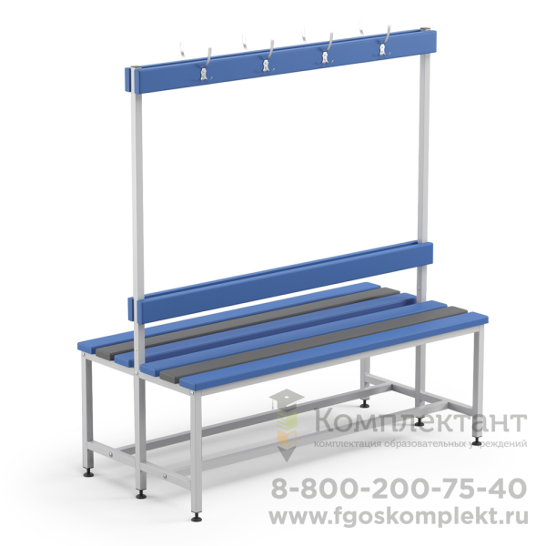 Двойная скамейка с сиденьем из пластиковых брусьев с вешалкой.