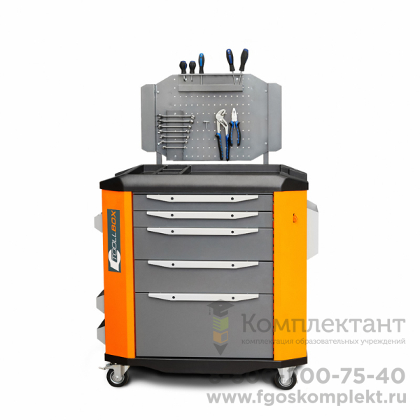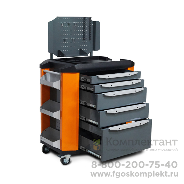 В заднюю стенку тележки встроен складной перфорированный экран, на который легко устанавливаются различные полки, держатели и крючки для инструмента (плоскогубцев, ключей, отверток, электроинструментов и т.п.)