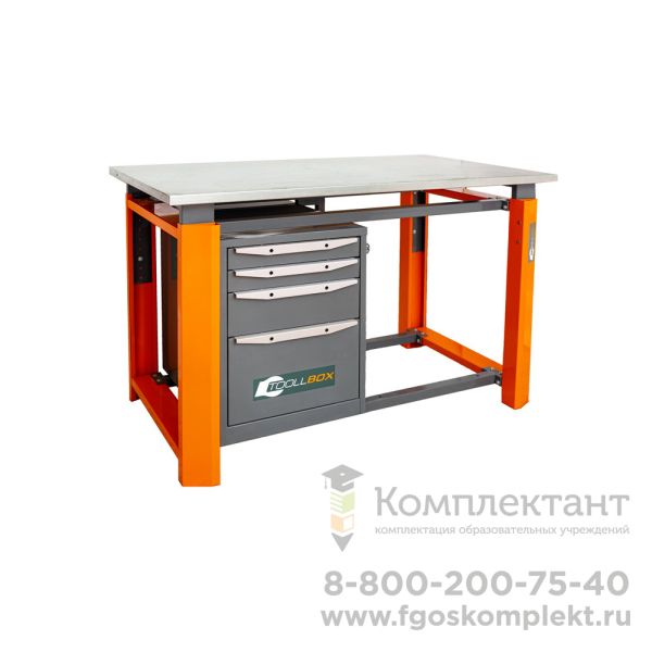 Столешница изготовлена из фанеры 30мм и закрыта стальным оцинкованным листом 1,2мм. Глубина столешницы 750мм. Предусмотрена регулировка положения столешницы по высоте. Высота регулировки столешницы верстака может регулироваться по желанию заказчика в диапазоне 924-1044 мм.