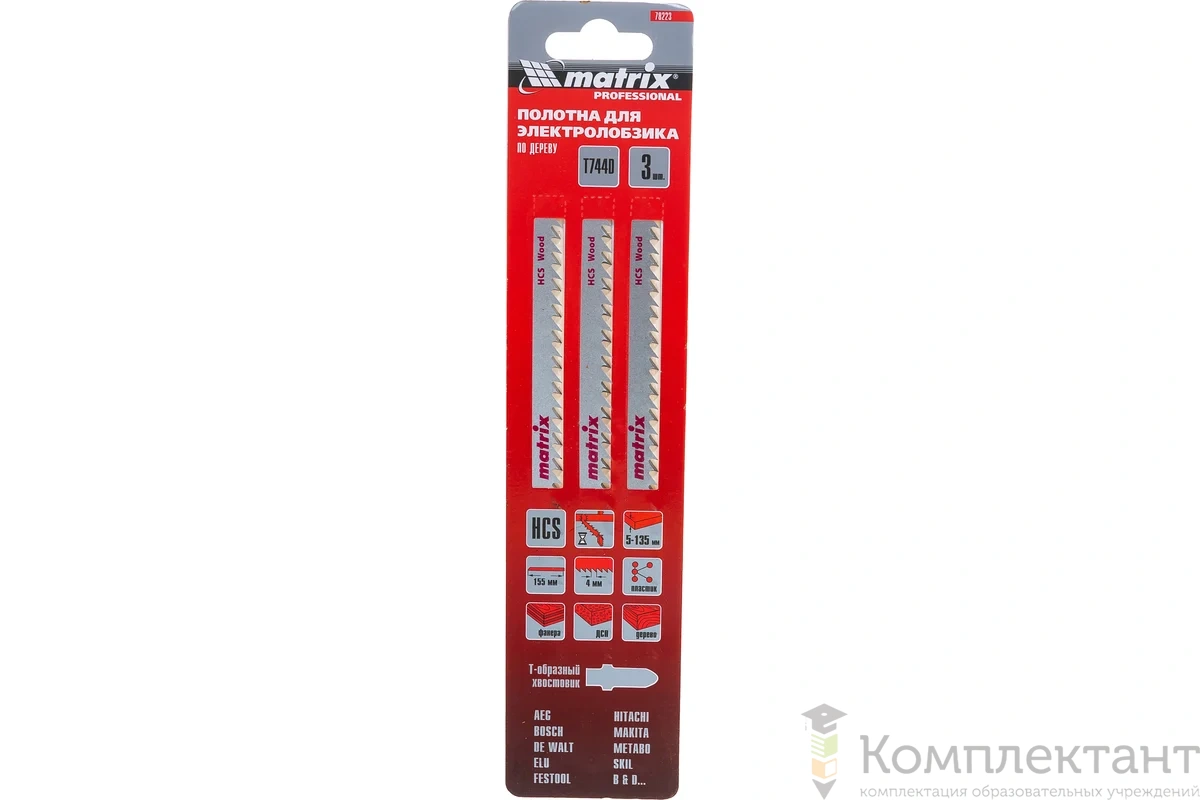 Полотна для электролобзика по дереву Matrix 78223, T744D, 155 х 4 мм, из стали HCS, 3 шт. в упаковке, предназначены для грубой быстрой распиловки древесины, пиломатериалов, ДСП толщиной от 5 до 135 мм, а также пластика и фанеры. Благодаря Т-образному хвостовику полотна совместимы с большинством электролобзиков ведущих производителей. Подходят для профессионального использования, будут полезны и в быту.
